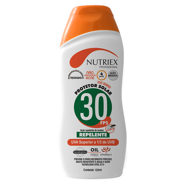 Oferece alta proteção à pele contra os efeitos nocivos da radiação solar, ajudando a prevenir as queimaduras solares. Com Tecnologia Bioactive Complex E®, complexo estável com fosfato de tocoferol biodisponível, com propriedades anti-oxidantes e anti-eritemas; e repelente de insetos de longa duração. AÇÃO HIDRATANTE, RÁPIDA ABSORÇÃO, TEXTURA LEVE. NÃO COMEDOGÊNICO. SEM CORANTE. Apresenta 2 horas de resistência à água e ao suor. Efetivo na proteção contra o mosquito Culex quinquefasciatus, Aedes aegypti e Anopheles sp.