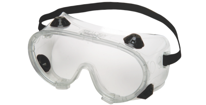Óculos de segurança, modelo ampla-visão, constituídos de armação confeccionada em uma única peça de PVC flexível transparente, com ventilação direta composta de orifícios no modelo perfurado e duas válvulas localizadas na parte inferior e superior da armação para ventilação indireta no modelo valvulado e visor de policarbonato incolor.