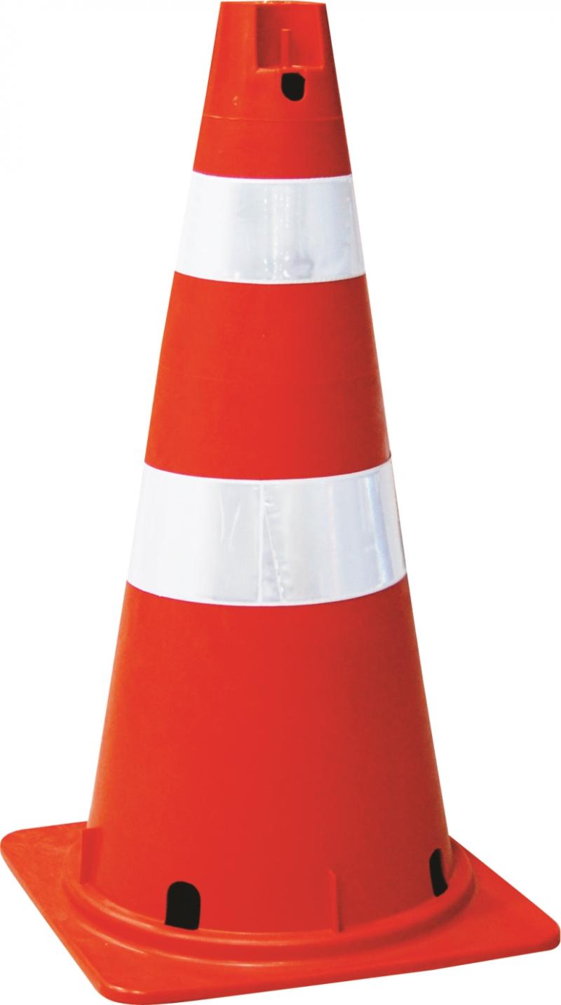 Cone para sinalização e segurança na cor laranja, 75 cm de altura, peso 1,550 kg, injetado em PEBD (polietileno de baixa densidade) numa peça única e com duas faixas refletivas coladas no corpo do cone. possui duas janelas para passagem de faixa zebrada e dois pinos para encaixe de corrente.